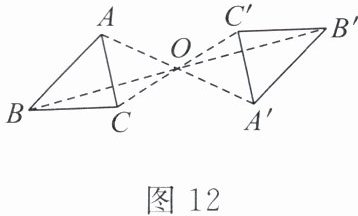 4. 如图 12,$\triangle ABC$与$\triangle A'B'C'$关于点$O$成中心对称,$\angle ABC = 45^{\circ}$,$\angle B'C'A' = 80^{\circ}$,则$\angle BAC =$