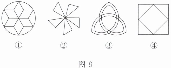 3. (教材第 3 页练习第 1 题变式)如图 8,标出下列旋转对称图形的旋转中心$O$,并指出这个图形至少需要旋转多大角度才能与原图形重合,再判断它们是不是中心对称图形.