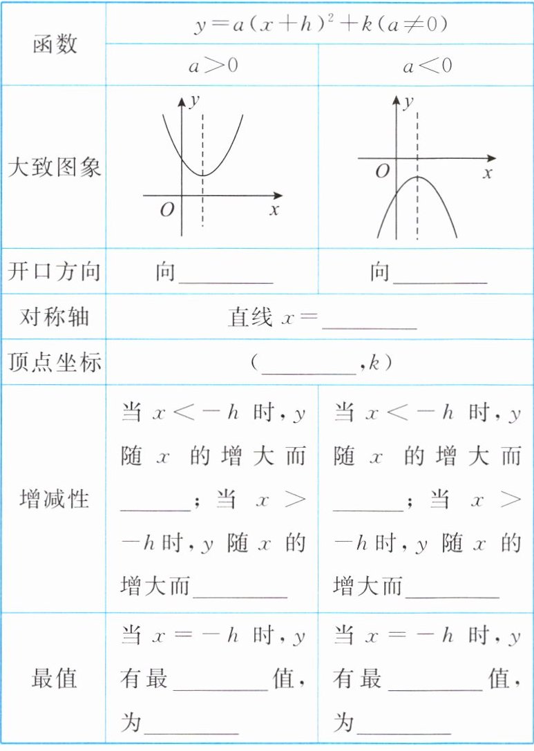 二次函数 $ y = a(x + h)^2 + k $ 的图象和性质: