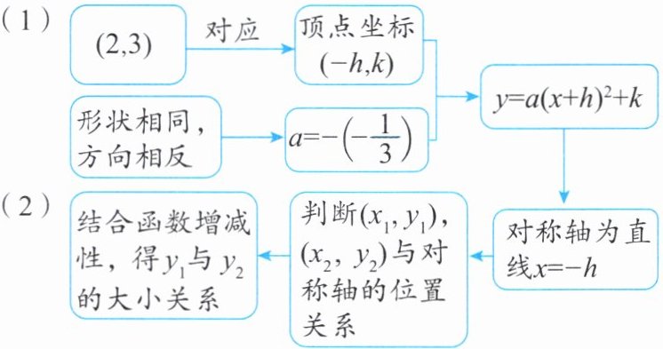 1. 因为抛物线 $ y = a(x + h)^2 + k $ 的顶点坐标为 $ (2, 3) $,所以 $ h = -2 $,$ k = 3 $。因为抛物线 $ y = a(x - 2)^2 + 3 $ 的形状与抛物线 $ y = -\frac{1}{3}x^2 $ 相同,但开口方向相反,所以 $ a = \frac{1}{3} $。因此抛物线 $ y = a(x + h)^2 + k $ 对应的函数表达式是 $ y = \frac{1}{3}(x - 2)^2 + 3 $。2. 因为抛物线 $ y = \frac{1}{3}(x - 2)^2 + 3 $ 的开口向上,对称轴为直线 $ x = 2 $,所以当 $ x < 2 $ 时,$ y $ 随 $ x $ 的增大而减小。又 $ x_1 < x_2 < 0 $,即 $ x_1 < x_2 < 2 $,所以 $ y_1 > y_2 $。