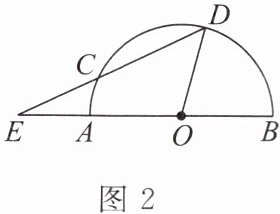 例 2 如图 2,$ AB $ 是半圆 $ O $ 的直径,$ D $ 是半圆上的一点,$ \angle BOD = 75^{\circ} $,延长 $ DC $ 交 $ BA $ 的延长线于点 $ E $,交半圆于点 $ C $,且 $ CE = AO $。求 $ \angle E $ 的度数。