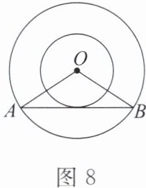 4. 如图8,以点O为圆心的两个同心圆中,大圆的半径为8cm,弦AB=8√{3}cm,小圆的半径为4cm.求证:直线AB与小圆相切.
