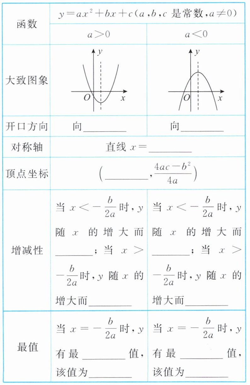 上;下;$-\frac{b}{2a}$;$-\frac{b}{2a}$;减小;增大;增大;减小;小;$\frac{4ac - b^2}{4a}$;大;$\frac{4ac - b^2}{4a}$