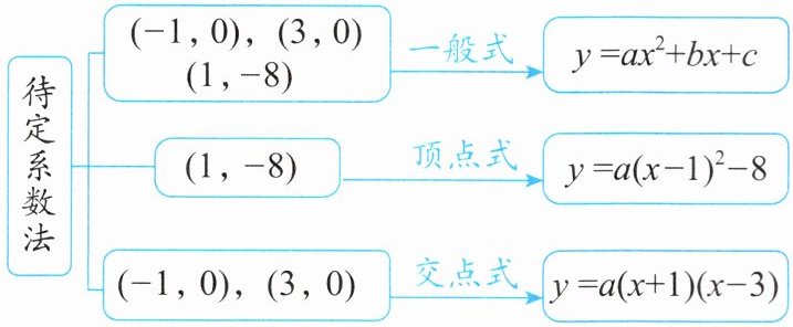 例 1 已知一个二次函数的图象经过 $(-1,0)$,$(3,0)$,$(1,-8)$ 三点,求这个函数的表达式。