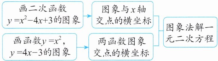 方法二:如图 3,分别画出函数 $ y = x^{2} $ 和函数 $ y = 4x - 3 $ 的图象。两图象交点的横坐标分别是 1 和 3,所以方程 $ x^{2} - 4x + 3 = 0 $ 的根是 $ x_{1} = 1 $,$ x_{2} = 3 $。