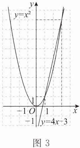 1. 画出函数 $ y = x^2 $ 和函数 $ y = 4x - 3 $ 的图象。