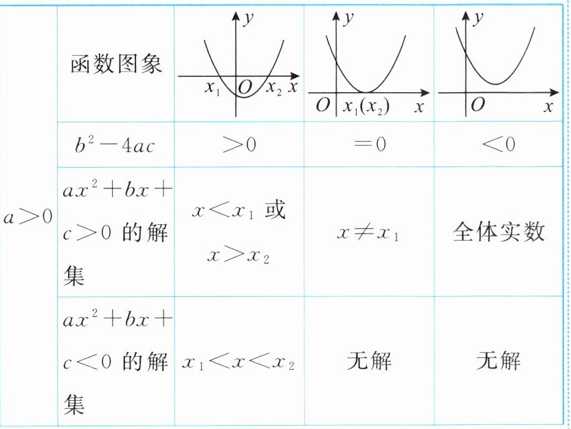 二次函数($y = ax^{2} + bx + c$)与一元二次不等式($ax^{2} + bx + c > 0$,$ax^{2} + bx + c < 0$)的关系: