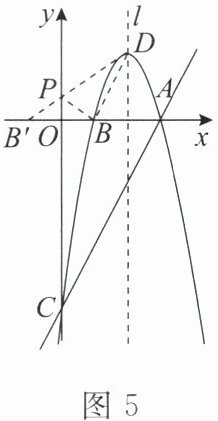 (2)如图5,作点B关于y轴的对称点B'(-1,0),连接B'D交y轴于点P,此时PB+PD=PB'+PD=B'D,其值最小,则△PBD的周长最小.