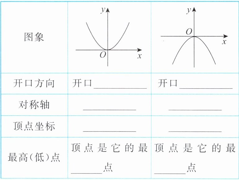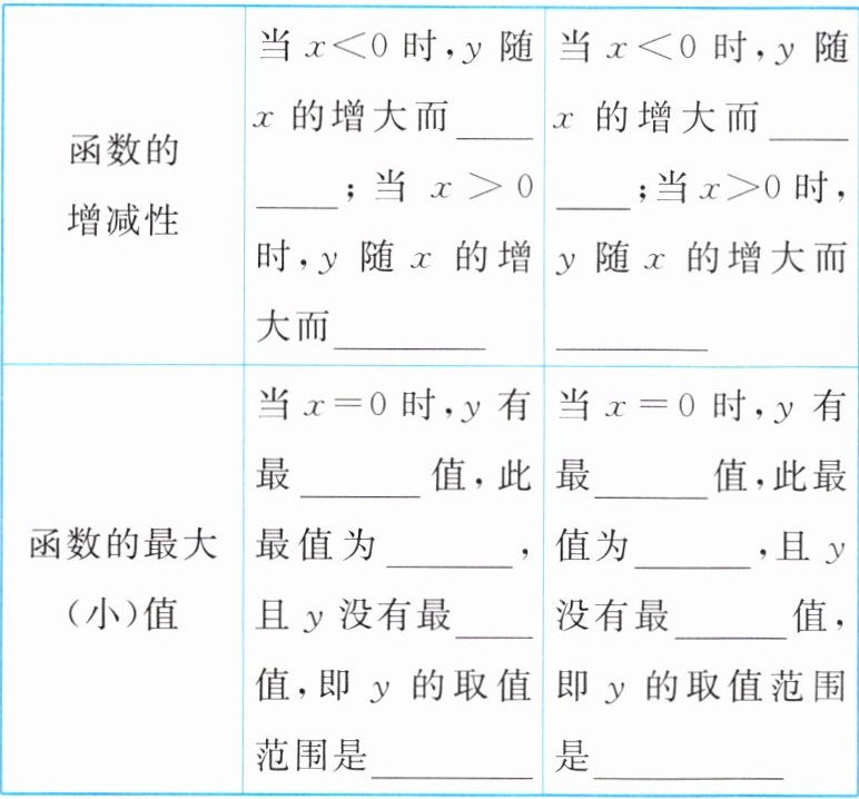 2.(第2列)向上 y轴$(0,0)$ 低 减小 增大 小 0 大 $y \geqslant 0$ (第3列)向下 y轴$(0,0)$ 高 增大 减小 大 0 小 $y \leqslant 0$