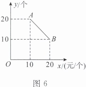 6. 某食品零售店新上架一款冷冻食品,每个成本为 $ 8 $ 元。在销售过程中,每天的销售量 $ y $(个)与销售价格 $ x $(元/个)的关系如图 6,当 $ 10 \leq x \leq 20 $ 时,其图象是线段 $ A B $。此食品零售店每天销售这款冷冻食品的最大利润为