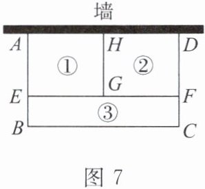 7. 为了节省材料,某农户利用一段足够长的墙体为一边,用总长为 $ 40 \mathrm { ~m } $ 的篱笆围成一个矩形菜地 $ A B C D $,且分成了图 7 所示的 $ 3 $ 块矩形区域①②③,这 $ 3 $ 块矩形区域的面积相等。