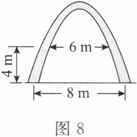 3. 某大学的校门是图 8 所示的抛物线形水泥建筑物,已知大门的地面宽度为 $ 8m $,两侧距地面 $ 4m $ 高处各有一个挂校名横匾用的铁环,两铁环的水平距离为 $ 6m $。求校门的最高点与地面的距离。(精确到 $ 0.1m $,水泥建筑物厚度忽略不计)