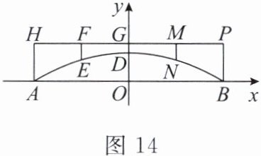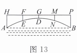 5. 图 13 是一座拱桥的示意图,相邻两支柱间的距离为 $ 10m $(即 $ HF = FG = GM = MP = 10m $),拱桥顶点 $ D $ 到桥面的距离 $ DG = 2m $。将其置于如图 14 的平面直角坐标系中,桥拱抛物线对应的函数表达式为 $ y = ax^2 + 6 $。