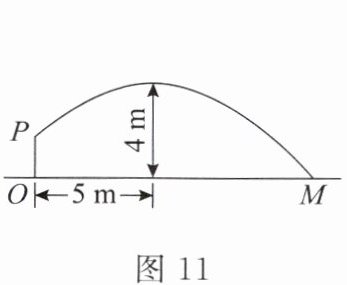 3. (2024 广西中考) 如图 11,壮壮同学投掷实心球,出手(点 $ P $ 处)的高度 $ OP $ 是 $ \frac{7}{4}m $,出手后实心球沿一段抛物线运行,到达最高点时,水平距离是 $ 5m $,高度是 $ 4m $。若实心球落地点为 $ M $,则 $ OM = $