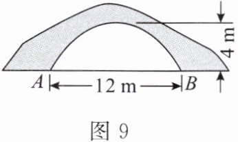 1. 图 9 是一座拱桥的示意图,已知桥洞的拱形是抛物线形,当水面宽 $ AB $ 为 $ 12m $ 时,桥洞顶部离水面 $ 4m $。以水平方向($ AB $ 所在直线)为 $ x $ 轴,建立平面直角坐标系,当选取点 $ A $ 为坐标原点时,抛物线对应的函数表达式是 $ y = -\frac{1}{9}(x - 6)^2 + 4 $。若选取点 $ B $ 为坐标原点,则抛物线对应的函数表达式是(