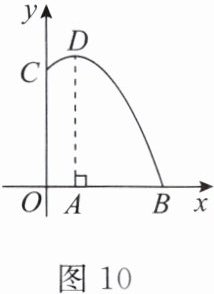 2. 某景点的“喷水巨龙”口中 $ C $ 处的水流呈抛物线形,该水流喷出的高度 $ y(m) $ 与水平距离 $ x(m) $ 之间的关系如图 10 所示,$ D $ 为该水流的最高点,$ DA⊥OB $,垂足为 $ A $。已知 $ OC = OB = 8m $,$ OA = 2m $,该水流距水平面的最大高度 $ AD $ 的长为(