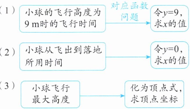 (1) 小球的飞行高度为 $ 9m $ 时的飞行时间 → 对应函数问题 → 令 $ y = 9 $,求 $ x $ 的值