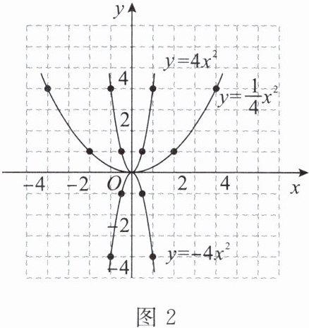 (2) 函数 $ y = 4x^2 $ 图象的顶点坐标为 $ (0, 0) $,开口向上,对称轴为 $ y $ 轴,有最低点且最低点的坐标为 $ (0, 0) $.