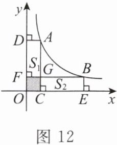 2. 如图 12,过双曲线 $ y = \frac{3}{x} $($ x > 0 $)上的 $ A $,$ B $ 两点分别向 $ x $ 轴、$ y $ 轴作垂线,垂足分别为 $ C $,$ D $,$ E $,$ F $,$ AC $ 与 $ BF $ 相交于点 $ G $,矩形 $ ADFG $ 和矩形 $ BECG $ 的面积分别为 $ S_1 $,$ S_2 $。如果 $ S_{ 阴影} = 1 $,那么 $ S_1 + S_2 = $