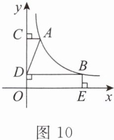 如图 10,反比例函数 $ y = \frac{k}{x} $($ x > 0 $)的图象经过 $ A $,$ B $ 两点,过点 $ A $ 作 $ AC \perp y $ 轴于点 $ C $,过点 $ B $ 作 $ BD \perp y $ 轴于点 $ D $,过点 $ B $ 作 $ BE \perp x $ 轴于点 $ E $,连接 $ AD $。已知 $ AC = 1 $,$ BE = 1 $,$ S_{ 矩形 BDOE} = 4 $,则 $ S_{\triangle ACD} = $ 。