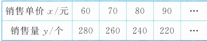 (1)一次函数y=-2x+400提示:由表格数据可知,销售单价每增加10元,销售量对应减少20个,所以这个函数是一次函数.设这个函数的表达式为y=kx+b,根据题意,得$\begin{cases}60k+b=280,\\70k+b=260.\end{cases}$解得$\begin{cases}k=-2,\\b=400.\end{cases}$故y=-2x+400.