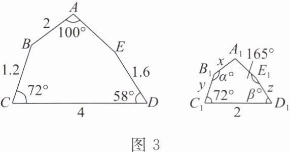 例2 如图3,五边形ABCDE与五边形A₁B₁C₁D₁E₁相似,求边长x,y,z的值及α,β的值.