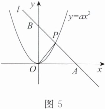 8. 如图 5,直线 $ l $ 过 $ A(4, 0) $,$ B(0, 4) $ 两点,它与二次函数 $ y = ax^2 $ 的图象在第一象限内交于点 $ P $. 若 $ S_{\triangle AOP} = \frac{9}{2} $,求这个二次函数的表达式.