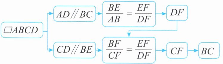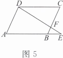 例 2 如图 5,点$E$是$□ ABCD$的边$AB$延长线上的一点,$DE$交$BC$于点$F,\frac {BE}{AB}=\frac {1}{3},EF = 2,BF = 1.5$.求$DF,BC$的长.