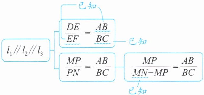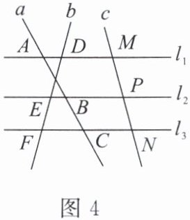 例 1 如图 4,直线$l_{1}// l_{2}// l_{3}$,直线$a,b,c$被直线$l_{1},l_{2},l_{3}$所截,$AB = 4,BC = 3,EF = 2.4,MN = 6.3$.求$DE,MP,PN$的长.
