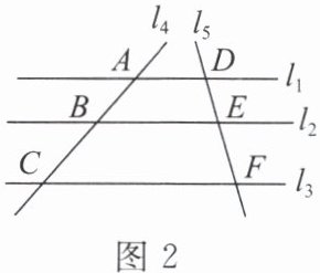 2. 如图 2,直线$l_{1}// l_{2}// l_{3}$,直线$l_{4},l_{5}$被直线$l_{1},l_{2},l_{3}$所截,截得的线段分别为$AB,BC,DE,EF$.若$AB = 4,BC = 6,DE = 3$,则$\frac {DE}{EF}=$
