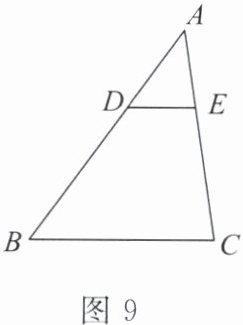 3. 如图 9,在△ABC 中,已知 DE // BC,AD = 4,DB = 8,DE = 3,那么$\frac{AE}{AC}$的值为