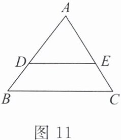 1. 如图 11,在△ABC 中,D,E 分别是 AB 和 AC 上的点,DE // BC。若$\frac{AD}{BD}=\frac{2}{1}$,则$\frac{DE}{BC}$的值为(