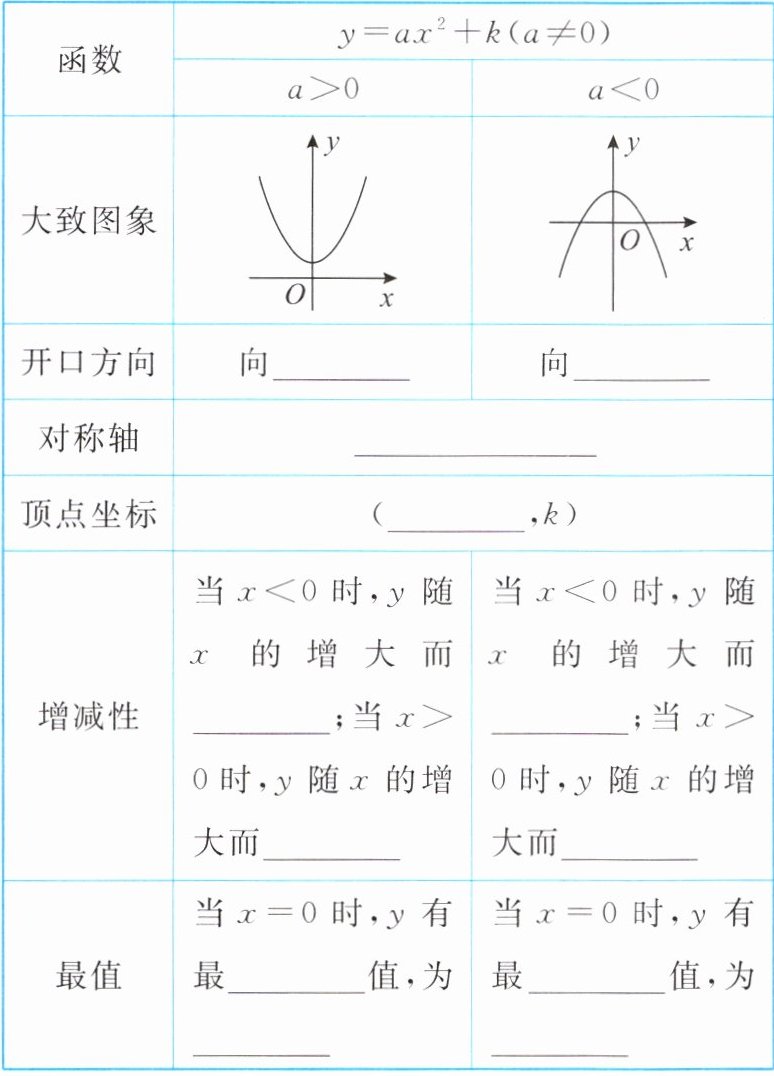 1. 二次函数 $ y = ax^2 + k $ 的图象和性质: