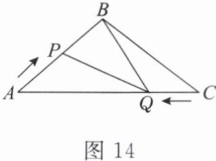 8. 如图14,在$\triangle ABC$中,$AB = BC = 20\ cm$,$AC = 30\ cm$,点$P$从点$A$出发沿$AB$以$4\ cm/s$的速度向点$B$运动,同时,点$Q$从点$C$出发沿$CA$以$3\ cm/s$的速度向点$A$运动.设运动的时间为$x\ s$,连接$PQ$,$BQ$.