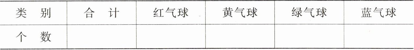 |类 别|合 计|红气球|黄气球|绿气球|蓝气球|