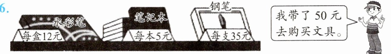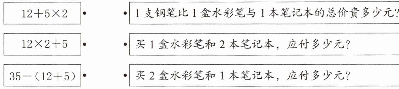 |$35 - (12 + 5)$|买 2 盒水彩笔和 1 本笔记本,应付多少元?|