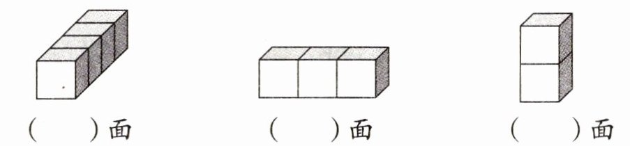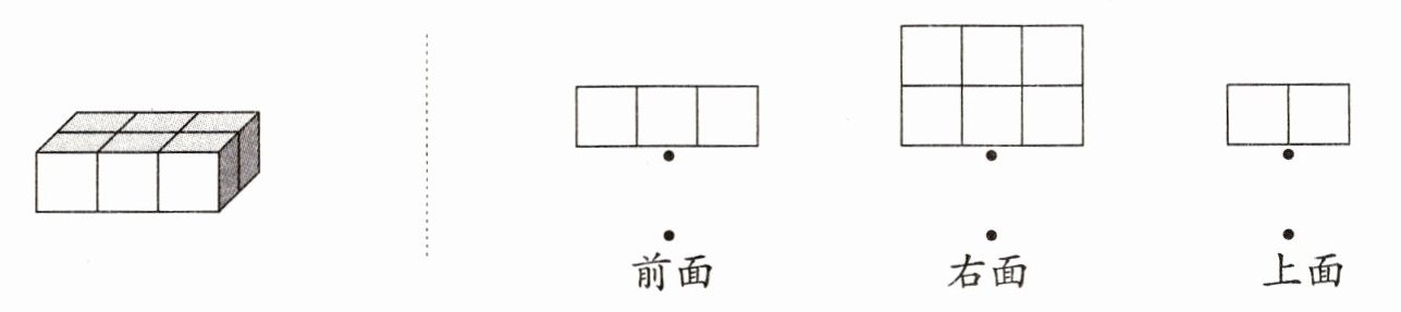 【解析】:从前面看,能看到3个横向排列的正方形;从右面看,能看到1个正方形(原解析中“2个”错误,根据常见立体图形摆放,该图从右面看应为1列1个正方形);从上面看,能看到2行3列共6个正方形。据此连线:前面连第一个图形,右面连第三个图形,上面连第二个图形。