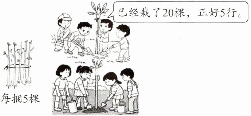 (3)答案不唯一,示例:已经栽了20根,正好5行,平均每行栽多少棵?20÷5=4(棵)