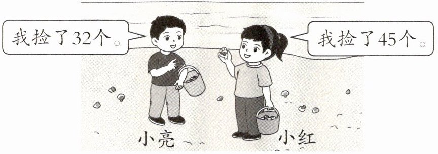 答案不唯一,示例:小亮和小红一共捡了多少个贝壳?32+45=77(个)