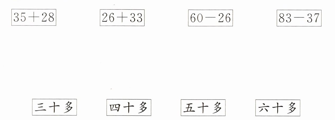 $\boxed{35 + 28}$ $\boxed{26 + 33}$ $\boxed{60 - 26}$ $\boxed{83 - 37}$