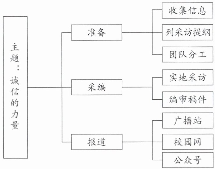 (1)示例:本次采访报道活动以"诚信的力量"为主题,分为准备、采编和报道三个阶段。在准备阶段,要收集采访对象信息、拟定采访提纲、做好团队分工;在采编阶段,先进行实地采访,再编审稿件;在报道阶段,通过广播站、校园网、公众号等平台进行宣传报道。