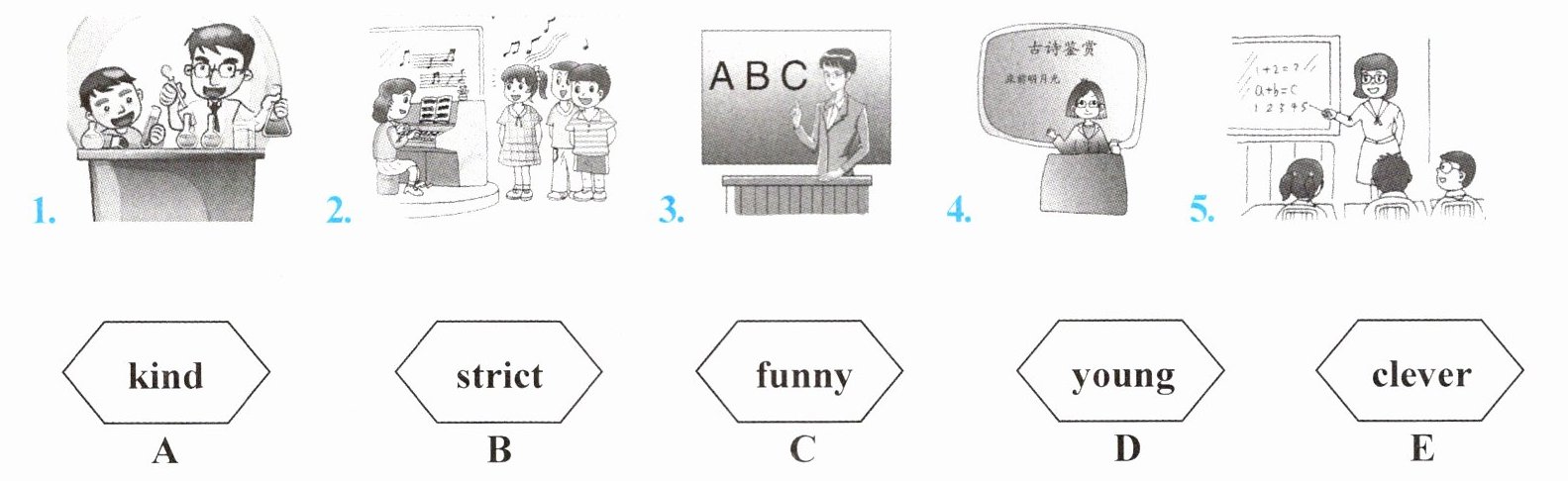A. quiet B. clever C. polite D. hard - working E. helpful