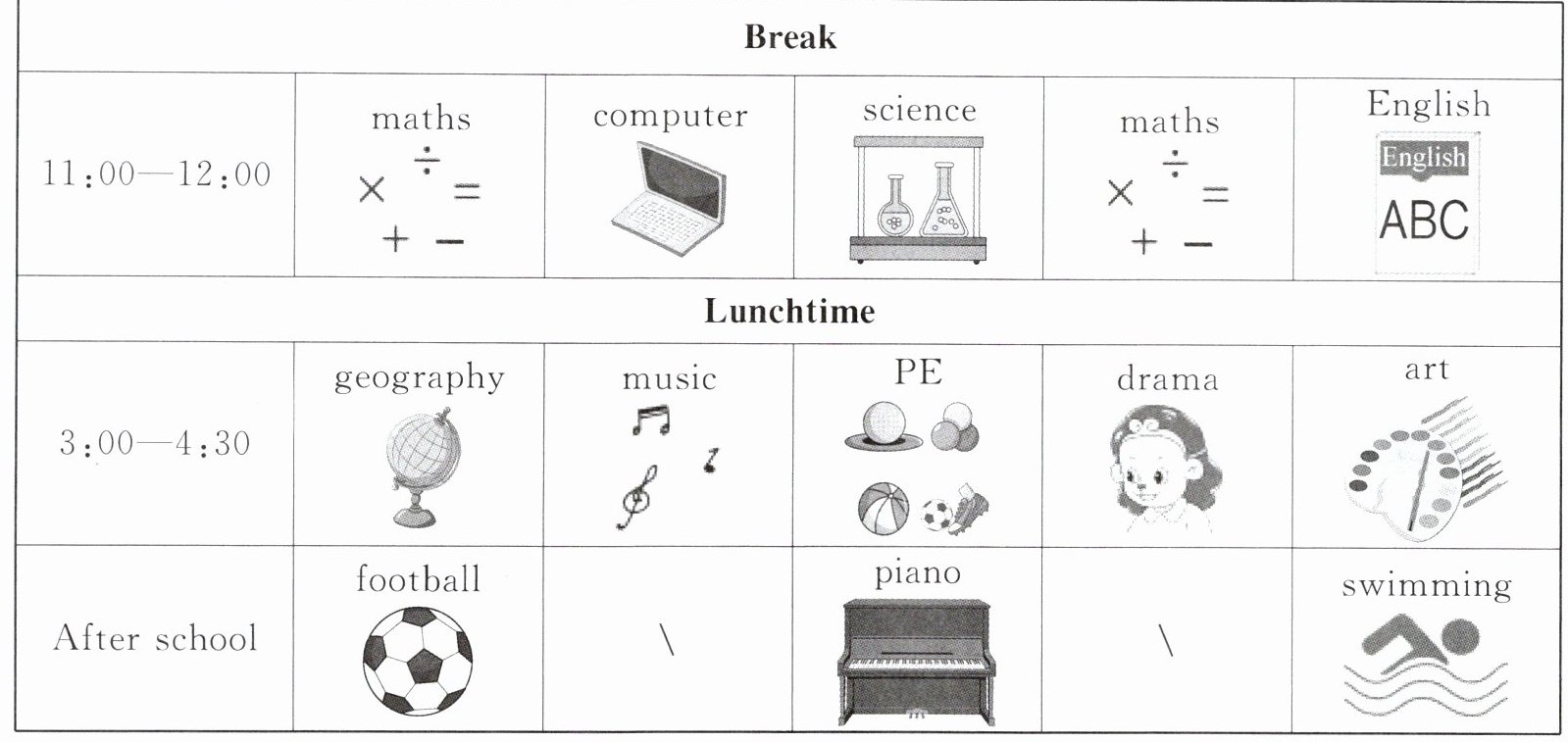 |After school|football| \ |piano| \ |swimming|