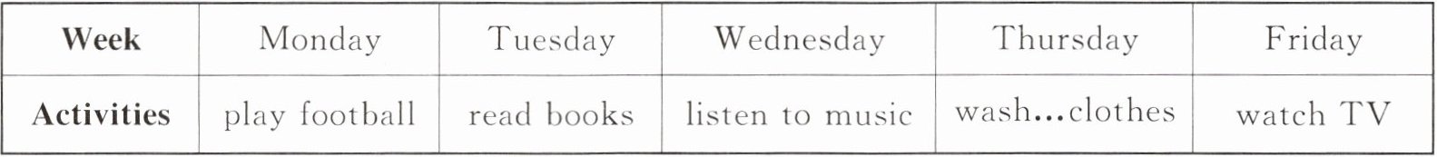 | Activities | play football | read books | listen to music | wash... clothes | watch TV |