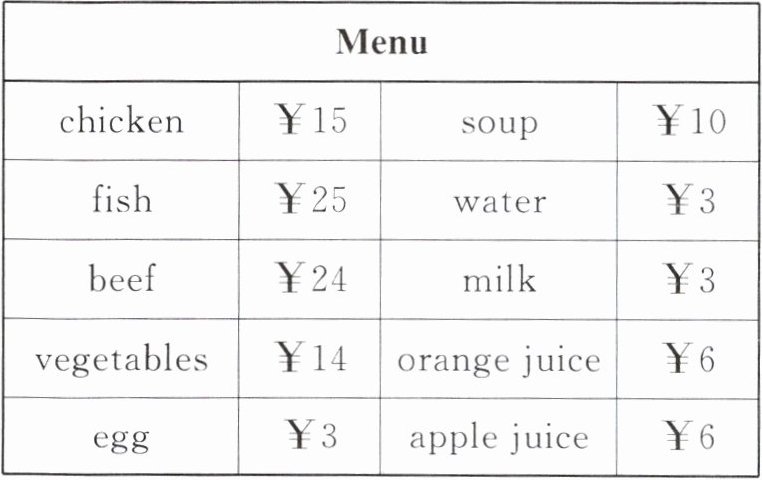 Waiter:Welcome! Here is today's menu. What would you like to eat?