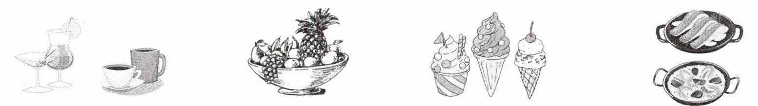 At the party, there is a lot of(许多的) food on the table. You can choose(选择) and eat them as you like. What would you like to eat first? You may eat fruit first because they are green and fresh. They are juicy(多汁的). Next, you may eat main courses(主菜) like chicken, fish and soup. They make you full. Then, you may try sweet food like cakes, puddings(布丁) and ice cream. They are called dessert(甜点). Have a cup of coffee(咖啡) or a cup of juice at last(最后). People can talk with a drink. They like drinking very much.