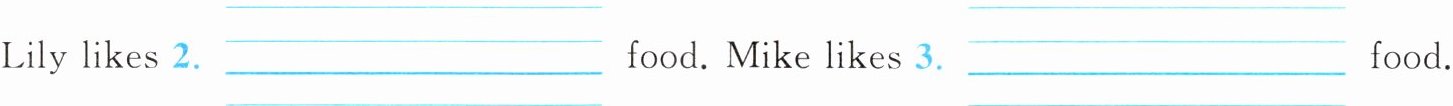 Lily likes 2. ____ food. Mike likes 3. ____ food.