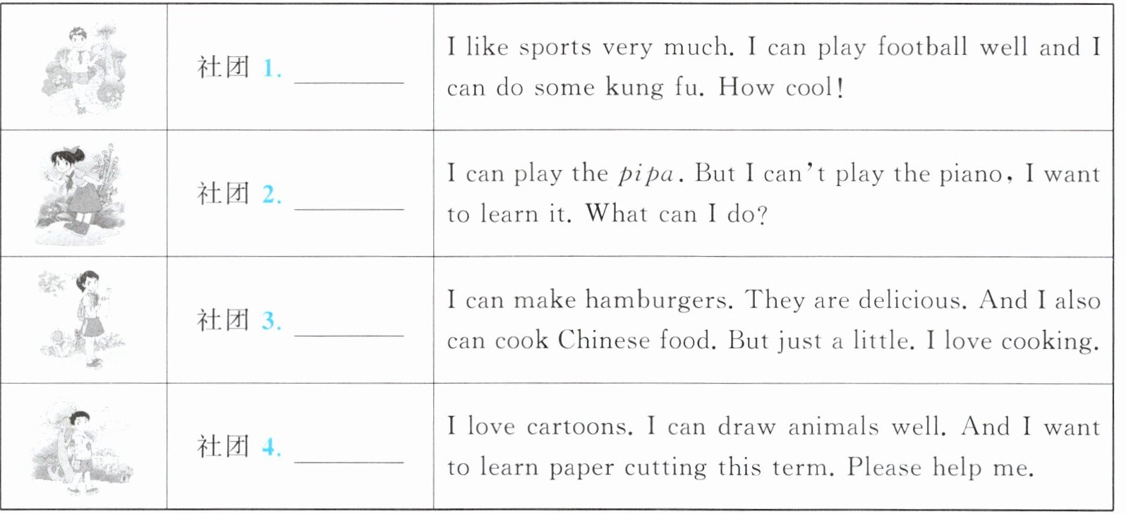 四、(“双减”政策实施后,学校开设了 Cooking Club 等精品社团。)请阅读以下信息,帮助同学们选择适合他们的社团吧。