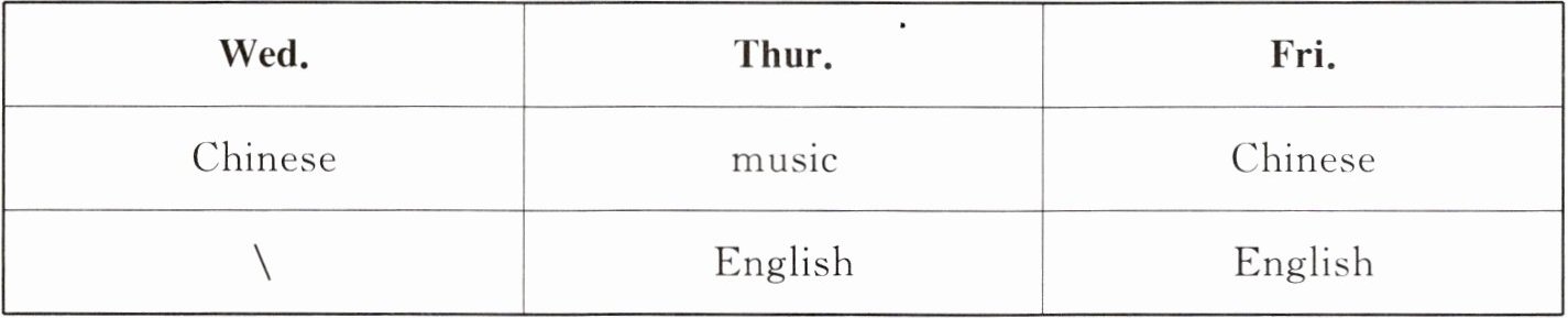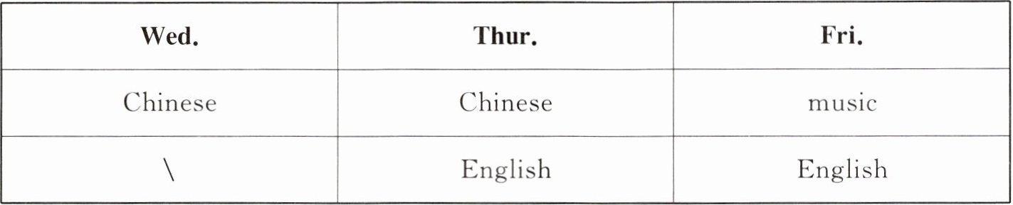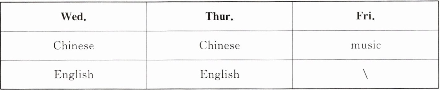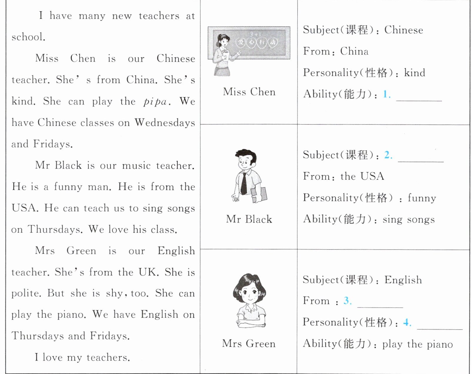 |Miss Chen is our Chinese teacher. She’s from China. She’s kind. She can play the *pipa*. We have Chinese classes on Wednesdays and Fridays.||Subject(课程): 2. ____From: the USAPersonality(性格): funnyAbility(能力): sing songs|