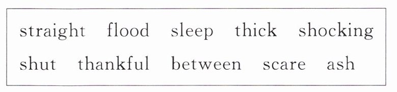 1. sleeping 2. scared 3. shut 4. shocking 5. straight 6. flood 7. thick 8. ash 9. Thankfully 10. between